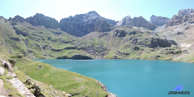 En 10 minutos más y tras 2 horas justas de subida a buen ritmo alcanzo el ibón de Ip (2.110 m).  Está enclavado en el bonito circo de Ip y rodeado de picos de más de 2.600 metros. Acostumbrado a verlo desde la cima de Collarada ahora parece mucho más grande.