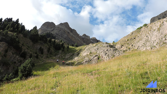 Terminado el flanqueo, la senda sale a una zona herbosa de fuerte pendiente que termina con otro pequeño resalte, que también se trepa fácilmente (I), y que da paso a una zona mucho más tendida que permite recuperar fuerzas.