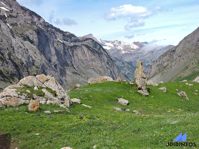Tras superar la subida por "La Cantalera" (1.535 m), la Canal de Izas se abre y se arrellana, mostrando una imagen absolutamente idílica con su curioso Campanal vigilando desde lo alto. Además, en estas fechas el valle está bien verde y repleto de agua y flores. Llevo 40 minutos.